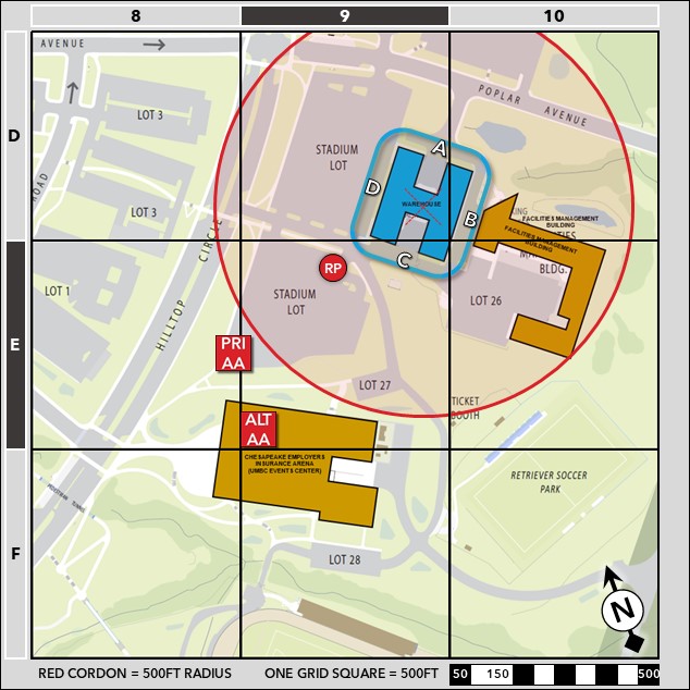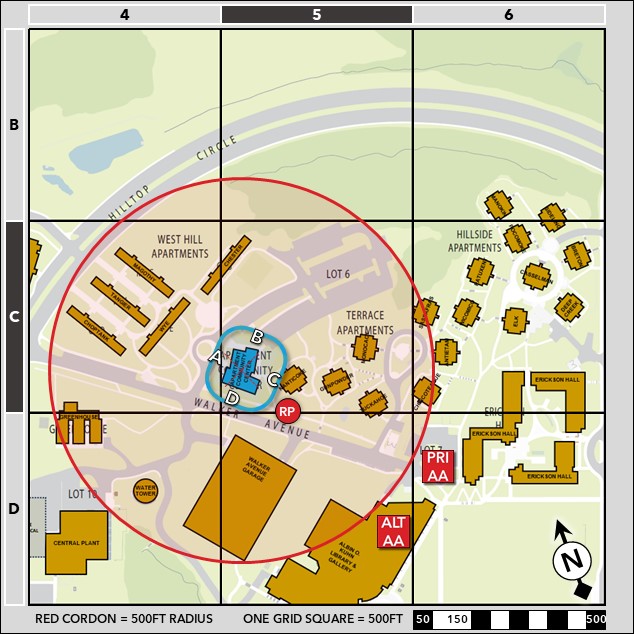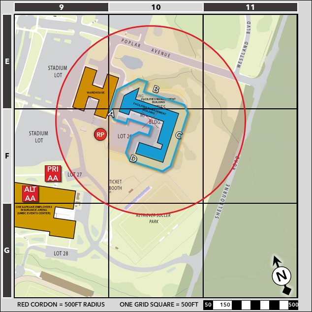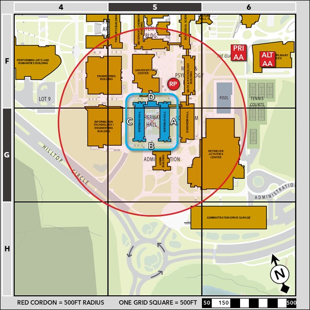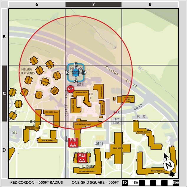 - The red circle is a 500-foot perimeter. Every building has a primary assembly area (PRI AA) outside this circle. Go to your primary assembly area if there is a confirmed threat at your building.